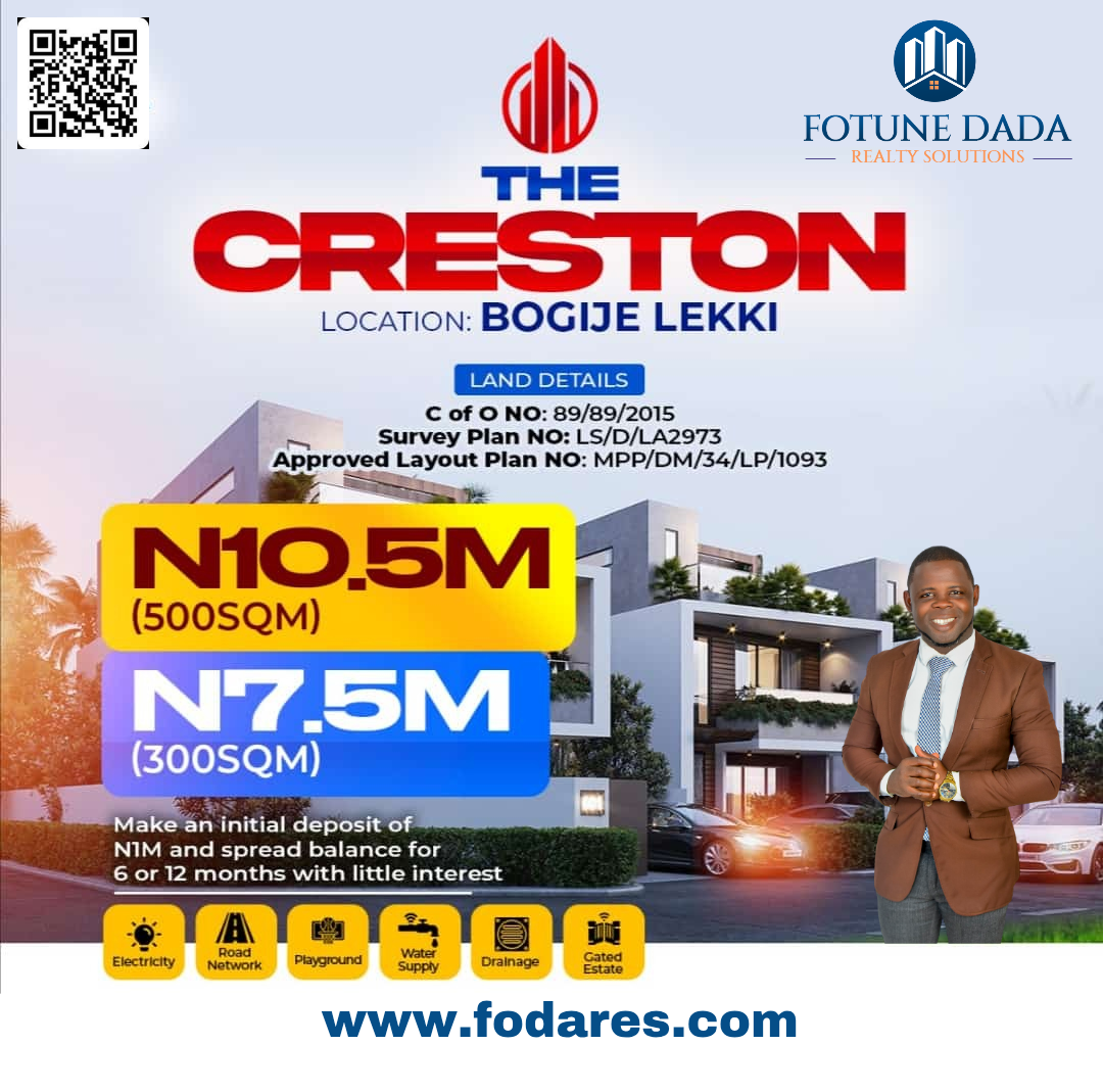 Description: THE CRESTON: Your Gateway to Premium Living in Bogije, LekkiNestled in a very developed and vibrant neighborhood of Bogije, Lekki. The Creston epitomizes luxury living with its impeccable design andp top-notch amenities. With a *Certificate of Occupancy* securing your investment, rest assured of peace of mind and security.*Primary signatory*:HRM Oba Abdulrasak Waliu Olasunkanmi (The Onibeju of Ibeju kingdom)*LOCATION:* BOGIJE, LEKKI*PRICE:*300sqm: N10.5 million500sqm: N13.5 million💳 *Payment Plan* : Take advantage of our flexible payment options by making an initial deposit of N1 million and spreading the balance over 6 to 12 months with minimal interest.*FEATURES:**Electricity*Good road network*Playground*Water supply*Drainage*Secure gated estate📞 For more enquiries, Call/WhatsApp: 08136932106Show all description